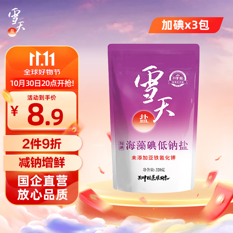 包邮 雪天海藻碘低钠盐320g*3【加碘】食用盐 家用烹饪调味品调料 深井岩盐